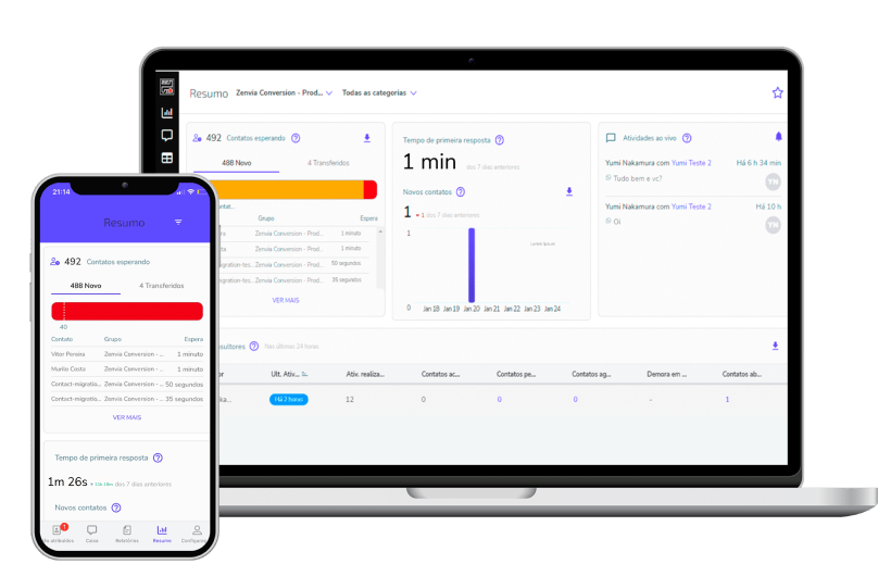 Relatórios detalhados e histórico de mensagens centralizados no card do contato, independentemente do canal utilizado.