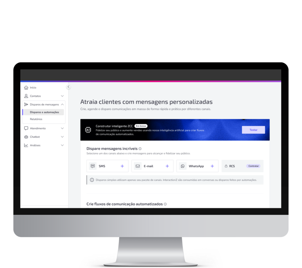 *Créditos de interações que ocorrem dentro do software | *Interações além das inclusas no plano | *Caso necessite habilitar WhatsApp e/ou RCS.