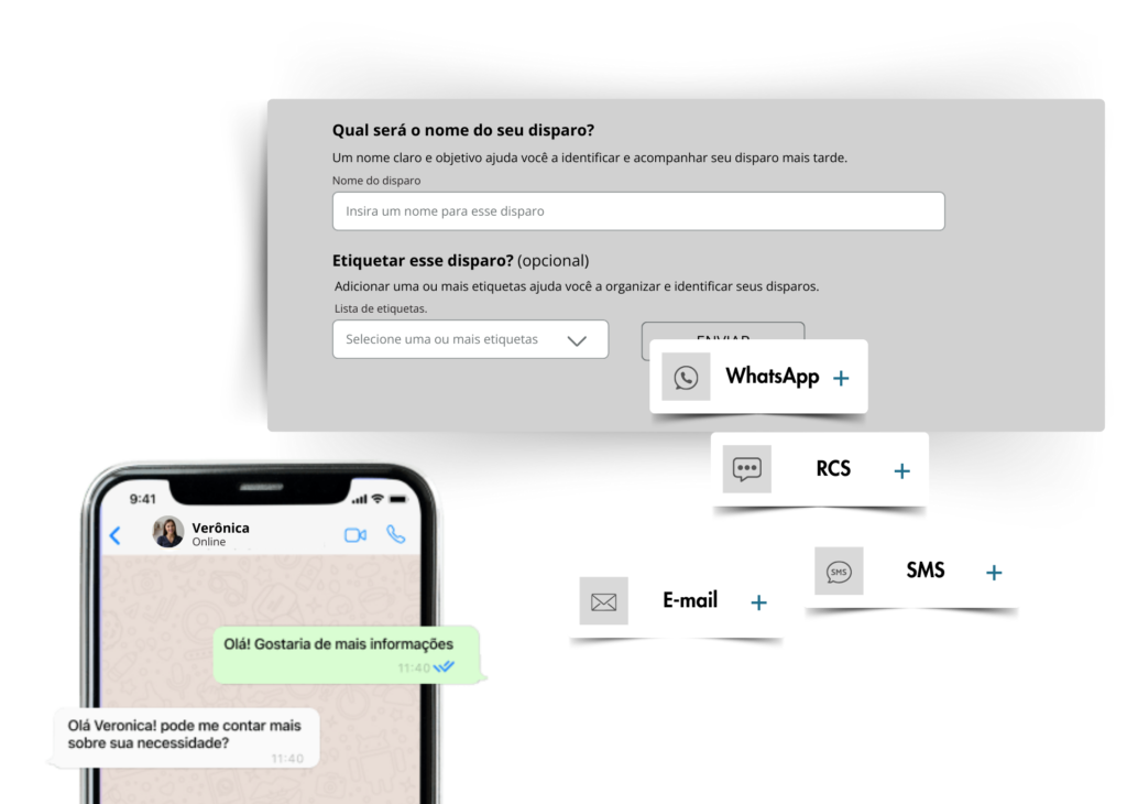 Alcance seu público pelos canais que eles preferem, envie mensagens em massa via: WhatsApp – E-mail – SMS – RCS